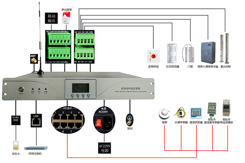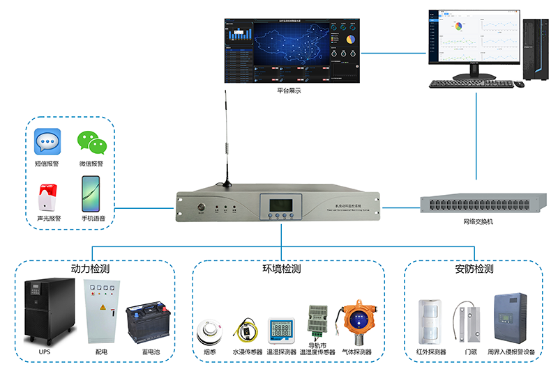 動環主機是一款集動力環境監控功能及入侵防盜報(bào)警於(yú)一體的設備,可實時監測機房 、基站等場所的動力設備運行狀态、環境參數、入侵報(bào)警,如市電、UPS、蓄電池、溫濕度、煙霧、漏水、門禁