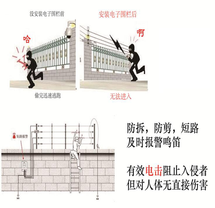 電子圍欄新的安防構思,是以阻擋爲主,報警爲輔。以阻擋、報警、監控爲一體,系統對入侵者給予瞬間脈沖電擊。具有極強的威懾作用。防止事件的發生,減少事件後處理工作量,減少社會犯罪率。電子圍欄可同警燈、警鈴、攝像等聯合使用,可遠程監控,可形成智能化。